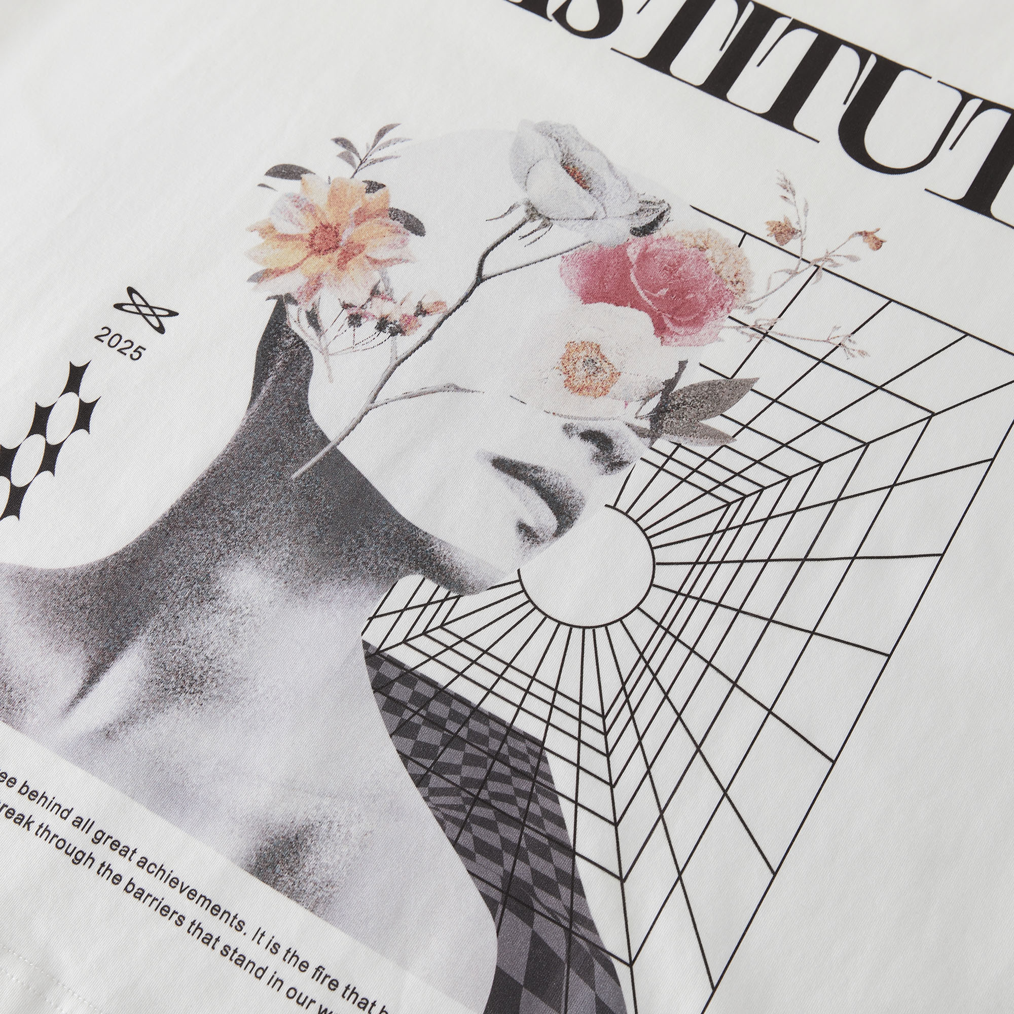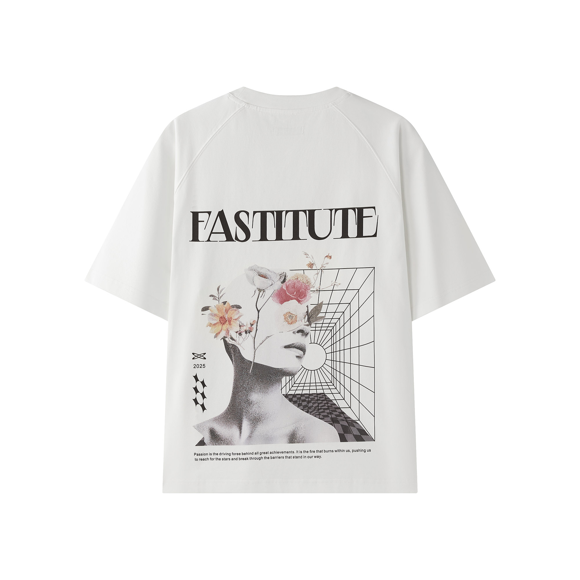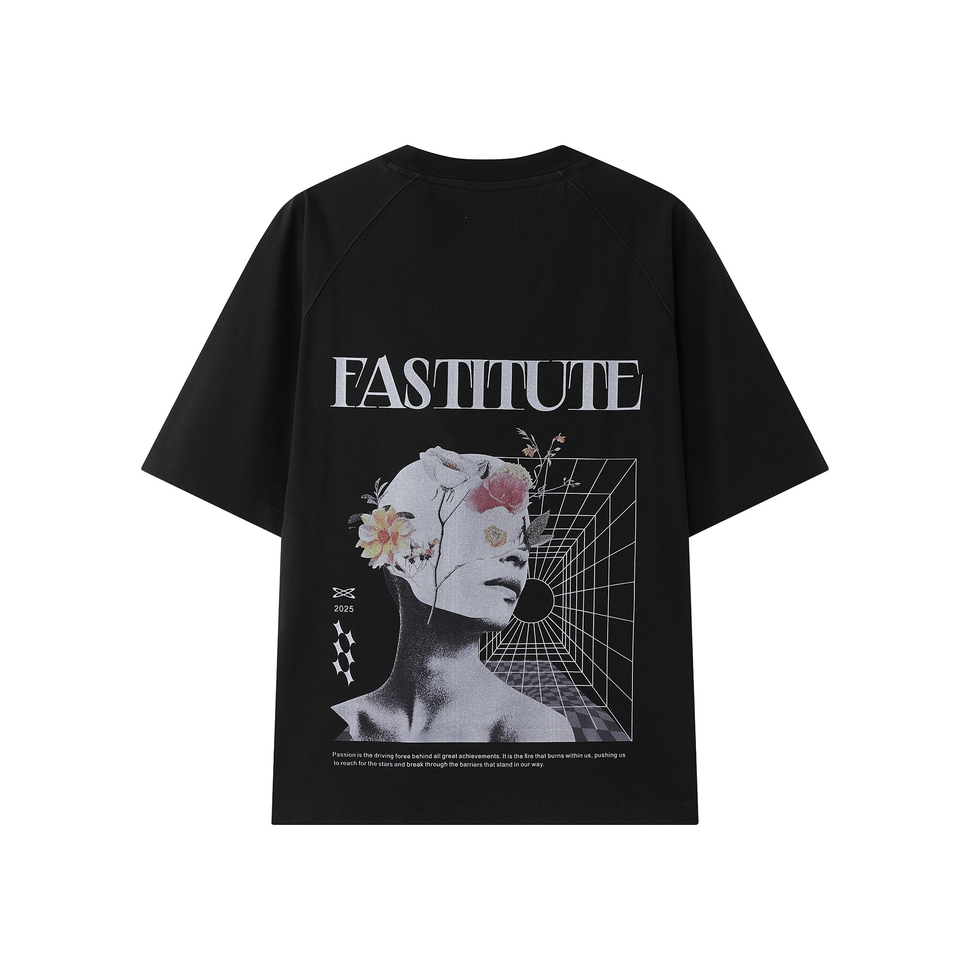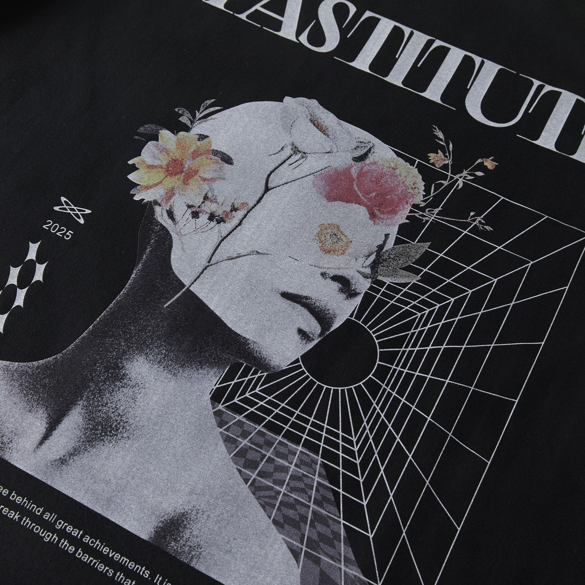 This T – shirt seamlessly combines simplicity and individuality. With a plain design on the front, it exudes pure charm and offers great versatility. The unique print on the back is an eye – catcher, featuring a combination of a human silhouette, floral, and geometric elements, creating a magical artistic vibe. The word “FASTITUTE” adds a trendy touch, showing a distinctive attitude and effortlessly enhancing street – style looks.